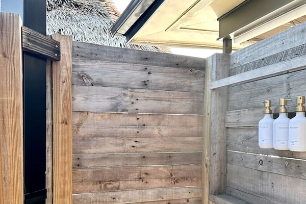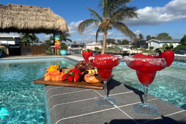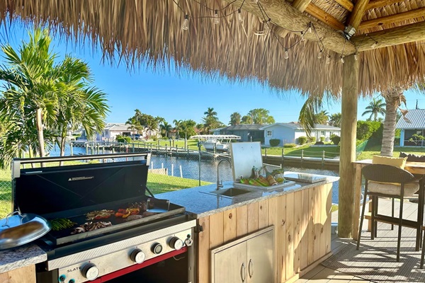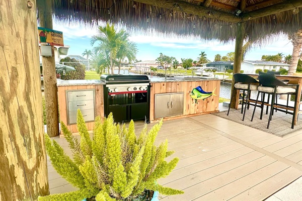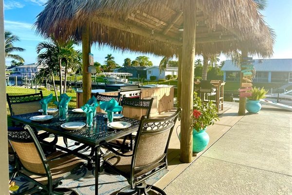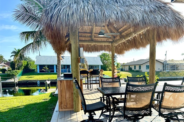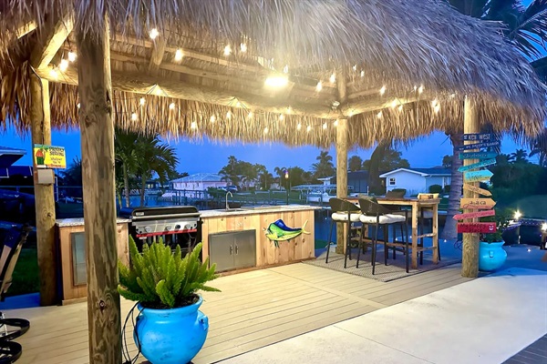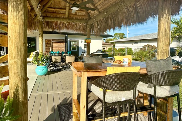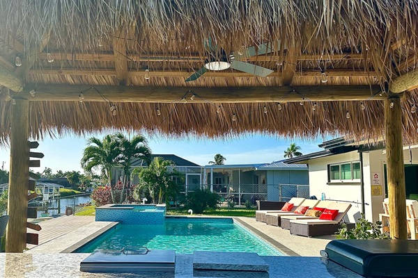 Outdoor kitchen under a large tiki hut by the pool