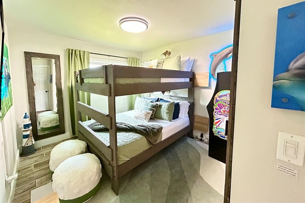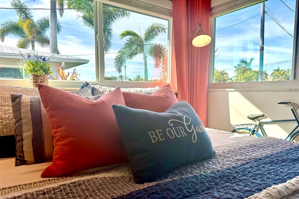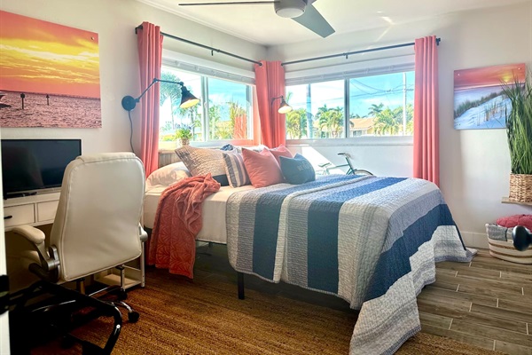 The Sunset room with King bed, workspace with printer, Nintendo Switch