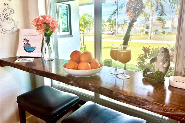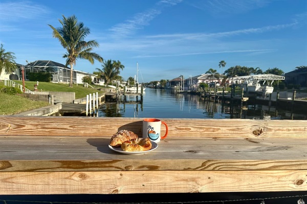 Dock table is perfect for a morning cup of coffee and a croissant from a local bakery