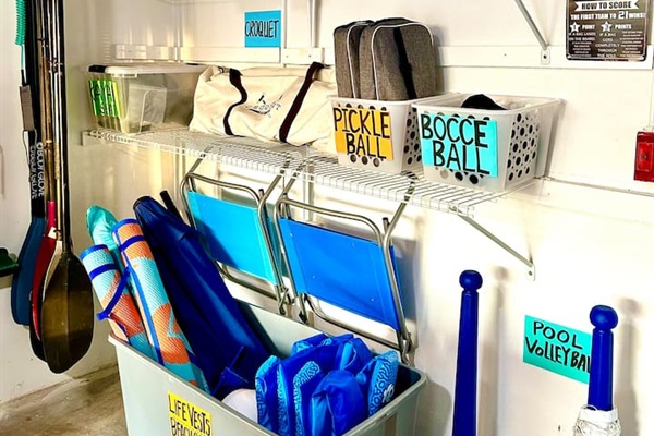 A variety of games, life vests, kayak paddles, & more. 2 bikes stored in shed outside the house for your enjoyment