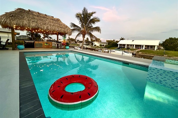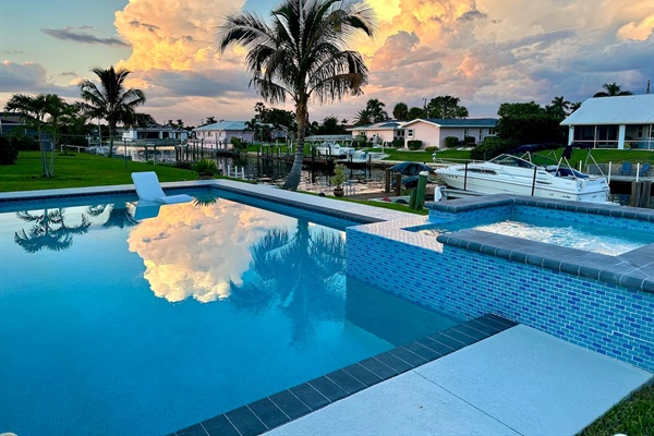 Sunset reflections over the pool and spa