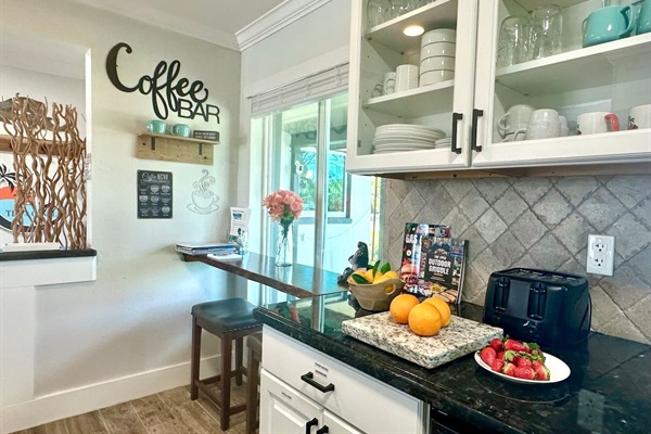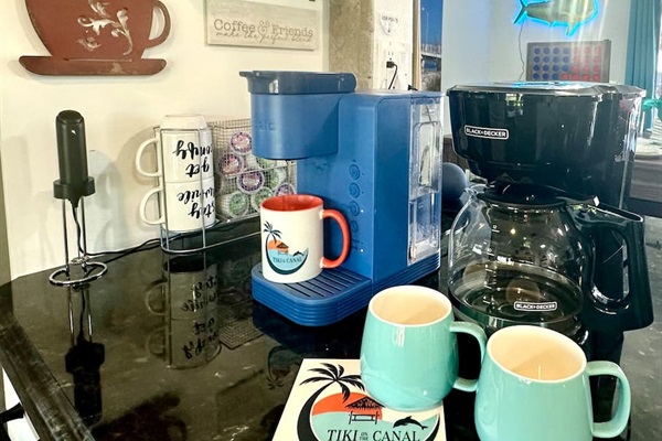 Coffee bar complete with everything you need, including a Nespresso maker with a few starter pods, a Keurig maker with pods, regular coffee maker, and much more! We also supply ground coffee and tea.